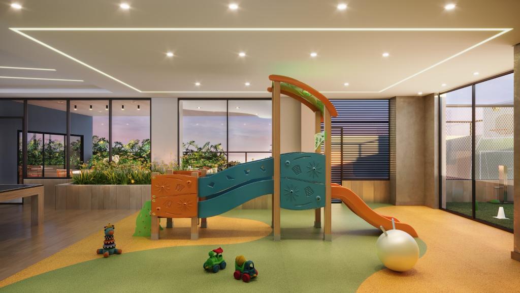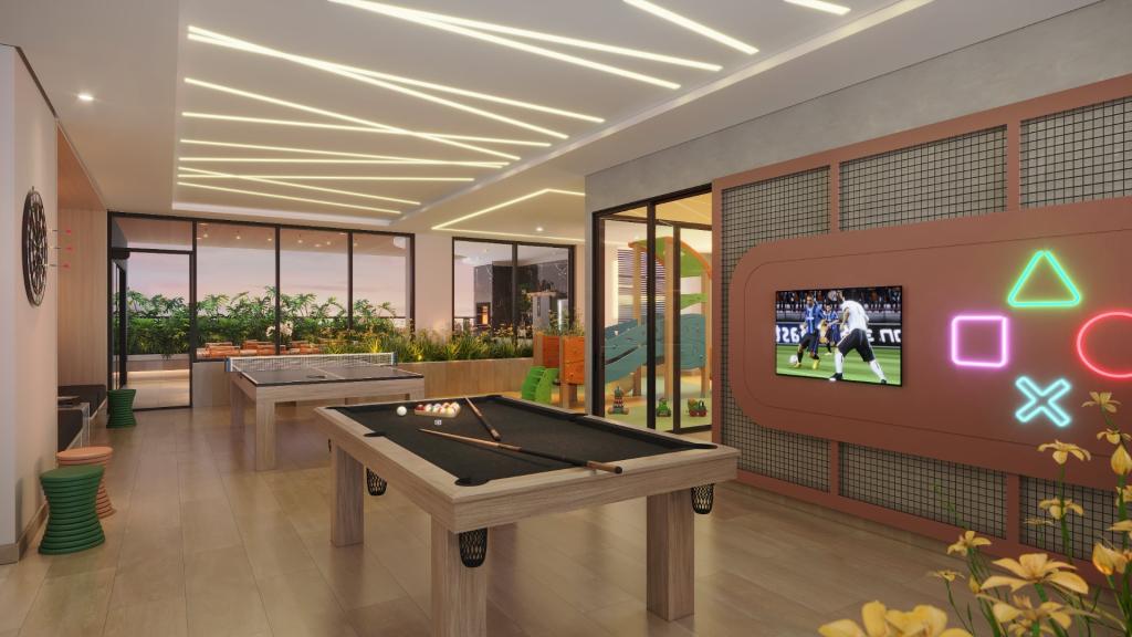 O condomínio se destaca por sua área de lazer completa, planejada para atender todas as idades e estilos de vida. Dispõe de academia equipada, espaço crossfit, piscinas adulto e infantil, deck molhado, sauna, espaço relax, snooker bar, varanda de jogos, quadra poliesportiva, espaço kids, playground, espaço gourmet, churrasqueira e salão de festas, proporcionando momentos de lazer, bem-estar e convivência sem sair de casa.